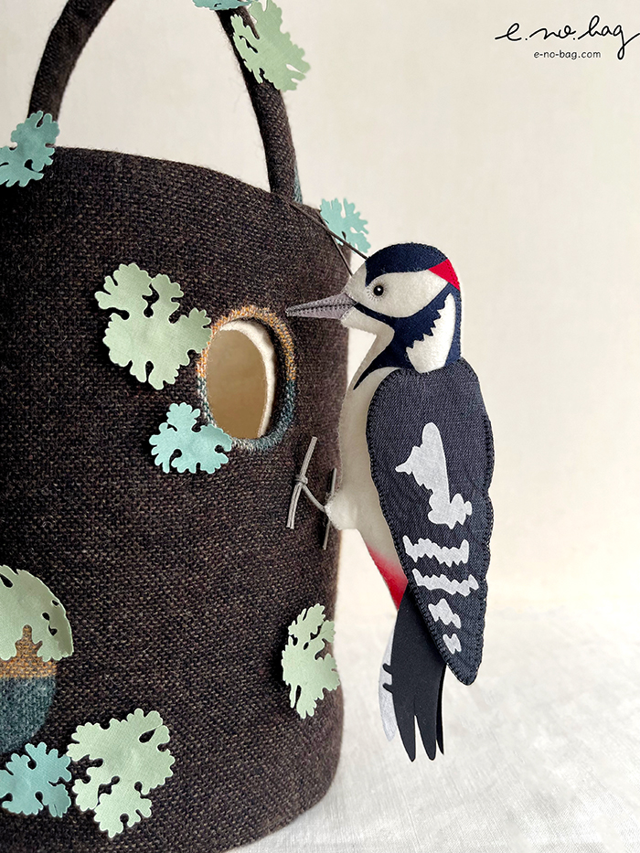 キツツキのバッグを作るなら、バッグに巣穴を開けるデザインにしたいと思っていました。生地を探していたところ、イメージにぴったりな素敵な生地に出会いました。ドット柄とキツツキの巣穴がリンクした、ユニークなバッグが完成しました。